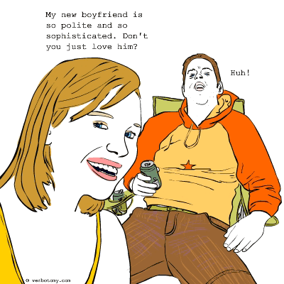 I am beyond the point where I feel the need to lay out all of this mans glaring faults to prove to my mother how inappropriate a partner he is, because he does this admirably whenever he opens his mouth. There is no love between them in any tangible way, and they don't even seem to know each other on even the most uperficial level: their conversations always hinge upon "Do you like...?" and "What would you...?" over the bare basics (food, movies, music) that are supposed to be established in the first month or so of an acquaintance...they have been together for over a year!